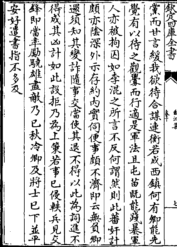 党而甘言缓我欲待合谋连衡若成西镇何有卿能先觉有以待之观衅而行适是军法且屯苗既能践暴军
