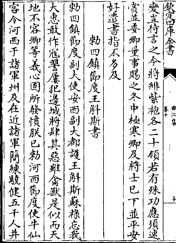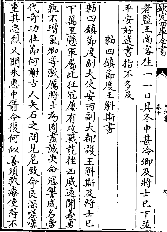 春晚极喧卿及将士巳下并平安好今赐卿衣一副至