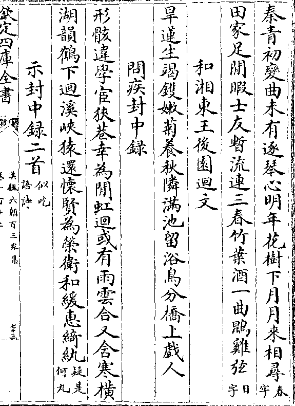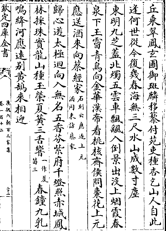 秦青初变曲未有逐琴心明年花树下月月来相寻(春/字)田家足閒暇士友暂流连三春竹叶酒一曲鹍鸡弦(日/字)
