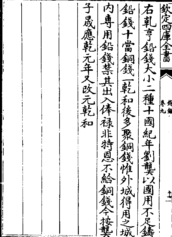 右乾亨铅钱大小二种十国纪年刘䶮以国用不足铸铅钱十当铜钱一乾和后多聚铜钱惟外城得用之城