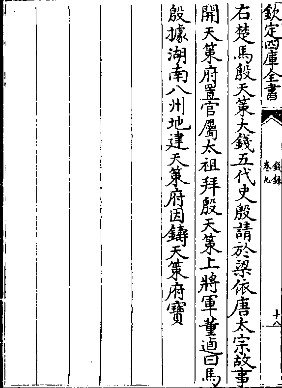 右楚马殷天策大钱五代史殷请于梁依唐太宗故事开天策府置官属太祖拜殷天策上将军董逌曰马