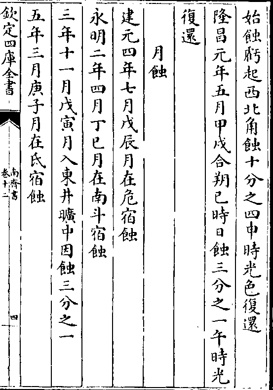 始蚀亏起西北角蚀十分之四申时光色复还隆昌元年五月甲戌合朔巳时日蚀三分之一午时光