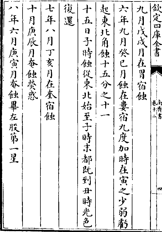 九月戊戌月在胃宿蚀六年九月癸巳月蚀在娄宿九度加时在寅之少弱亏