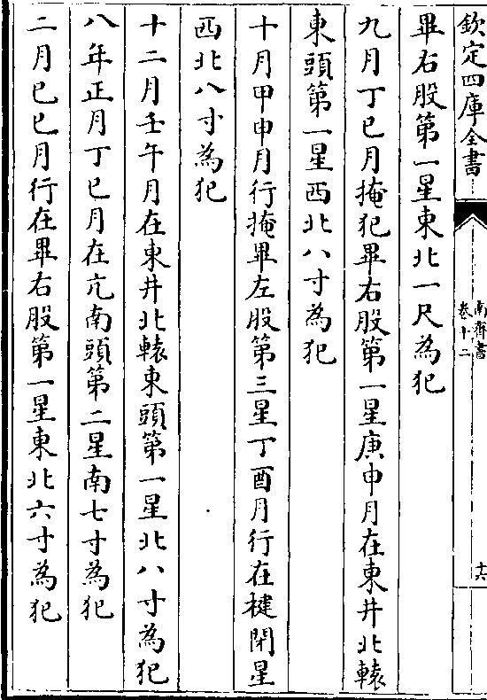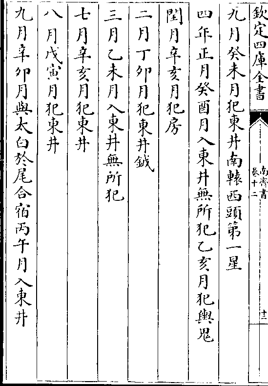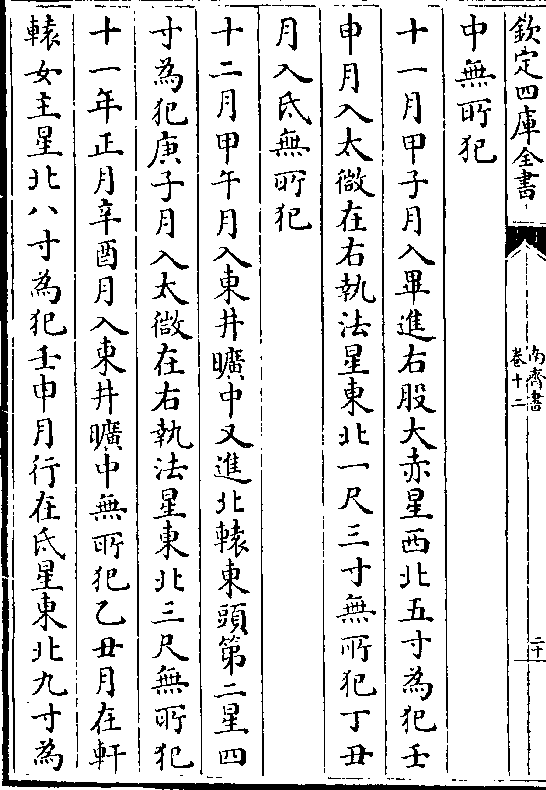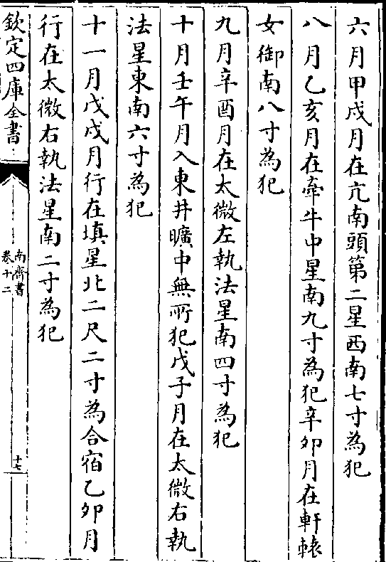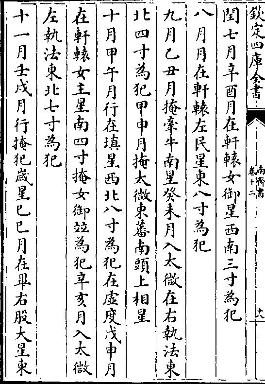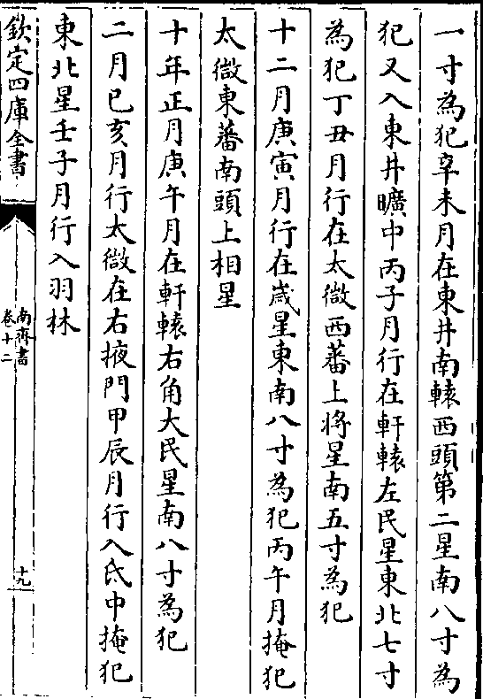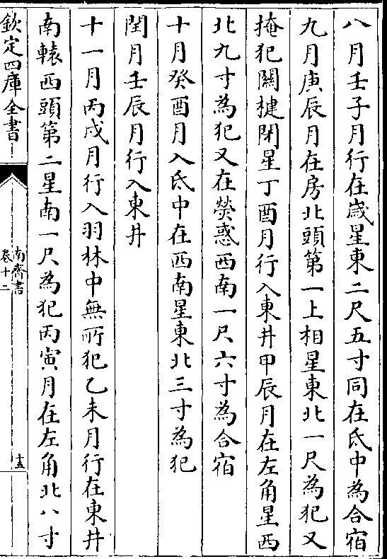 一寸为犯辛未月在东井南辕西头第二星南八寸为犯又入东井旷中丙子月行在轩辕左民星东北七寸