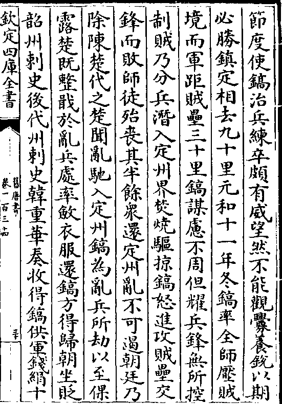 节度使镐治兵练卒颇有威望然不能观衅养锐以期必胜镇定相去九十里元和十一年冬镐率全师压贼