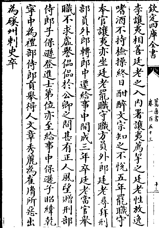 嗜酒不持检操终日酣醉文宗知之不悦五年罢职守夲官让夷亦坐廷老罢职守职方员外郎廷老寻拜刑