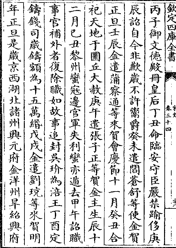 辰诏自今非歉岁不许鬻爵癸未遣阎苍舒等使金贺正旦壬辰金遣蒲察通等来贺会庆节十一月癸丑合