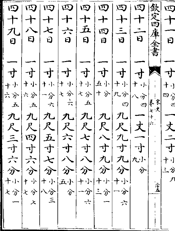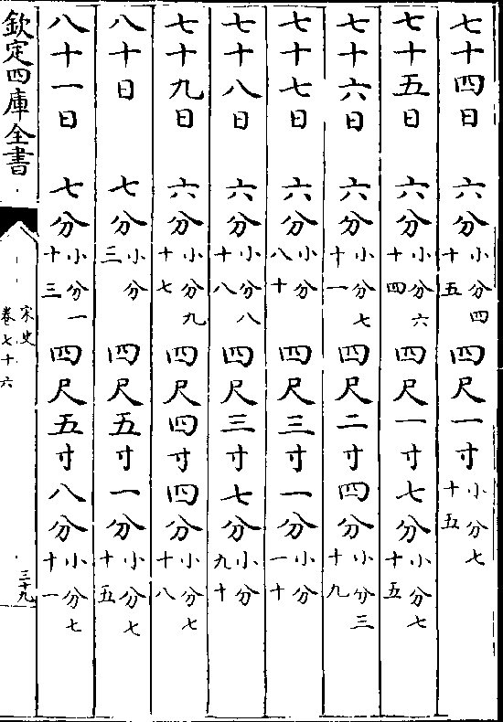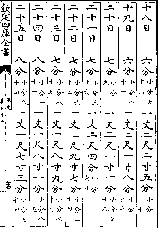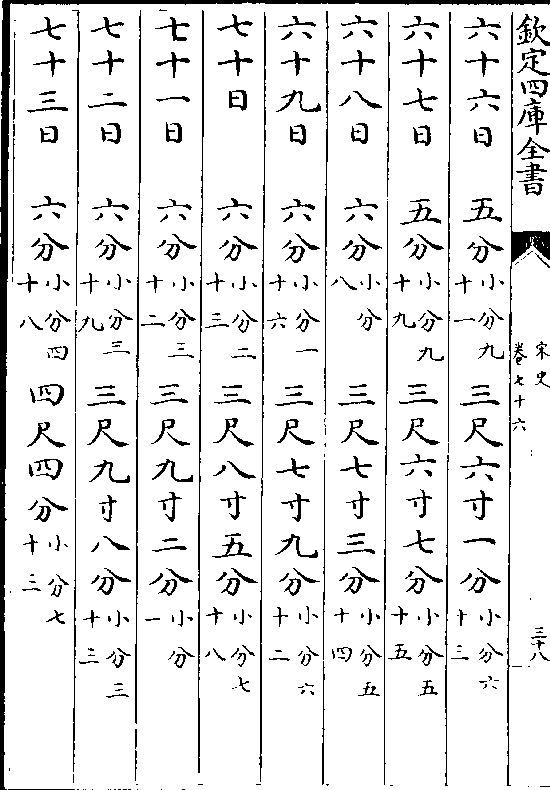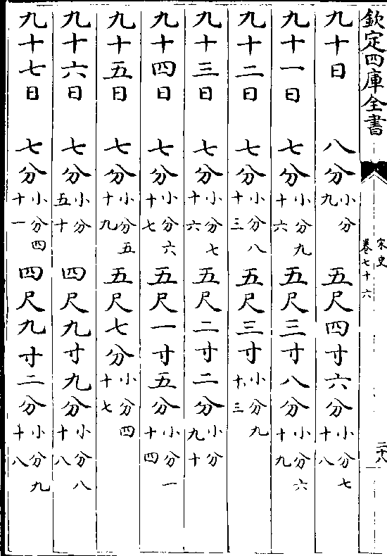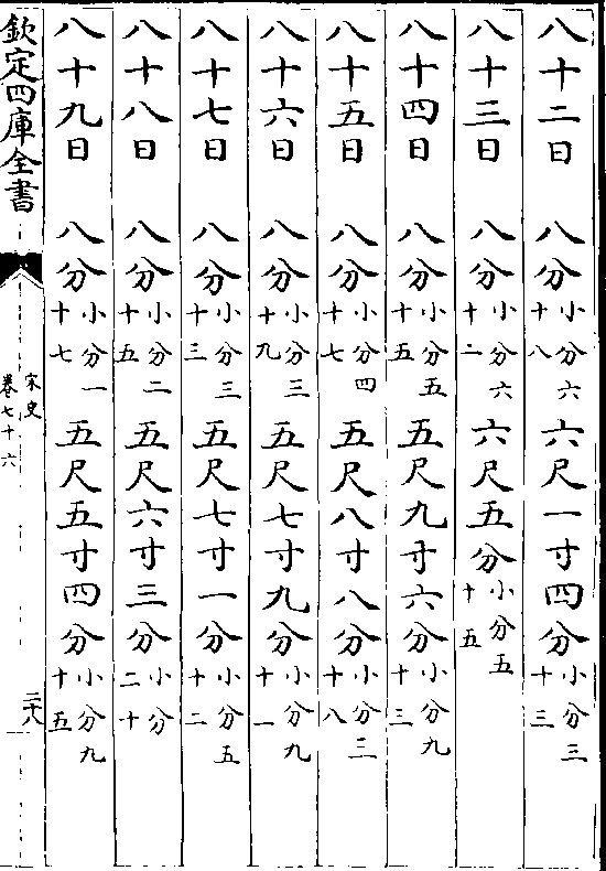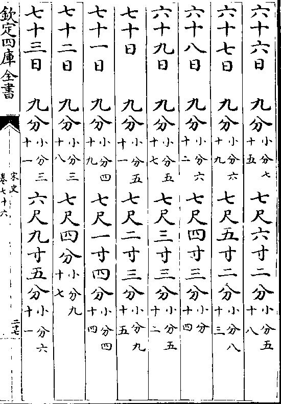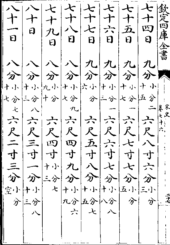 一百一十五日九分(小分七十) 七尺四寸六分(小分八十三)一百一十六日九分(小分七十八)七尺五寸六分(小分五十三)