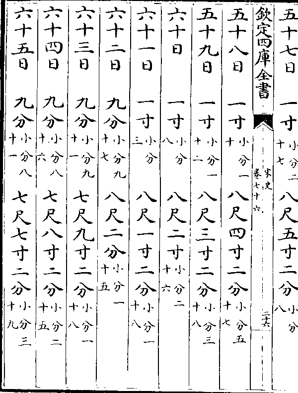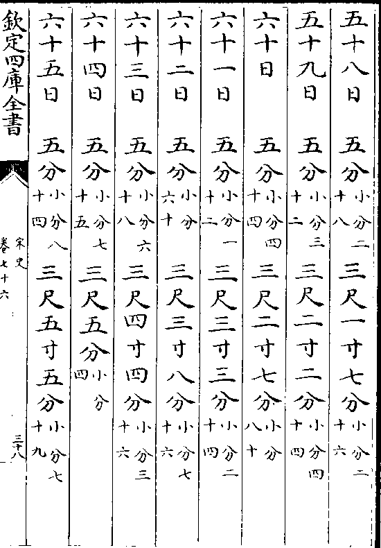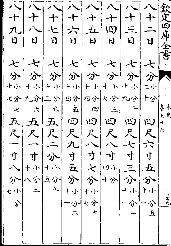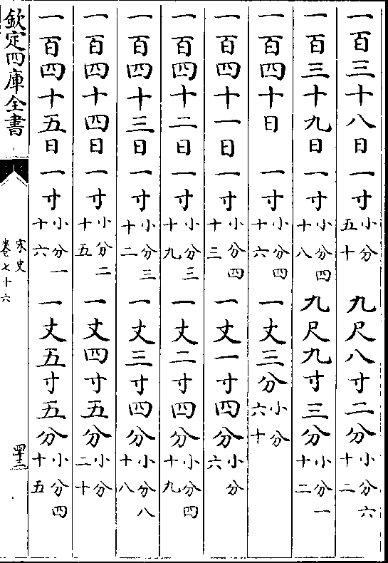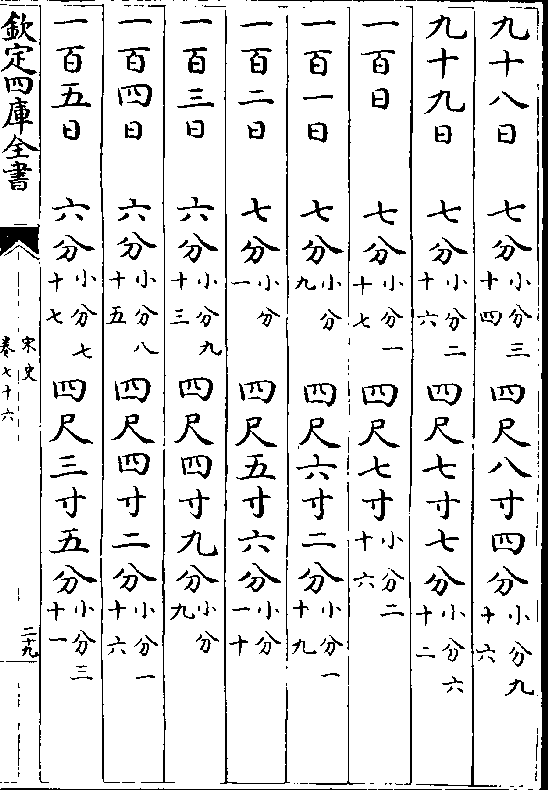 一百三十八日一寸(小分五十) 九尺八寸二分(小分六十二)一百三十九日一寸(小分四十八)九尺九寸三分(小分一十二)