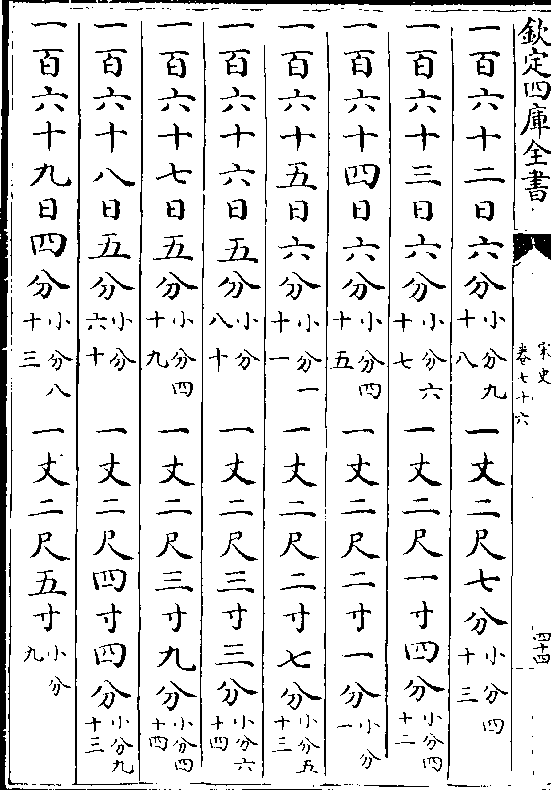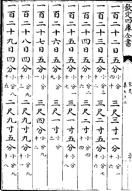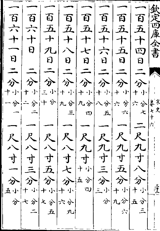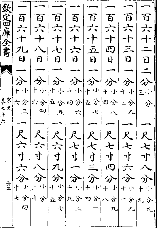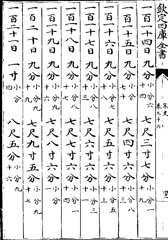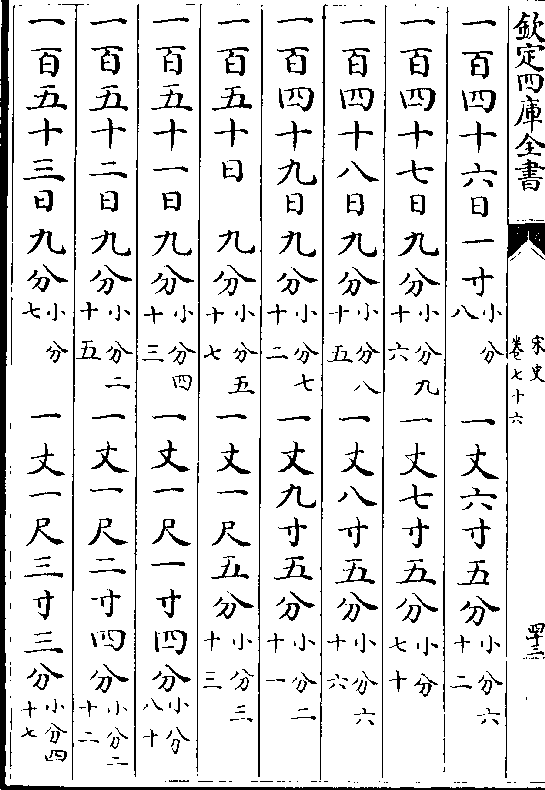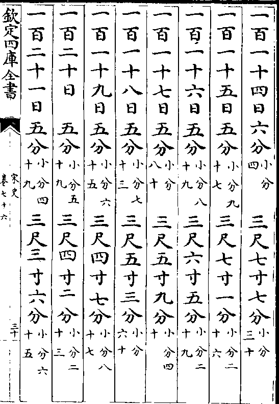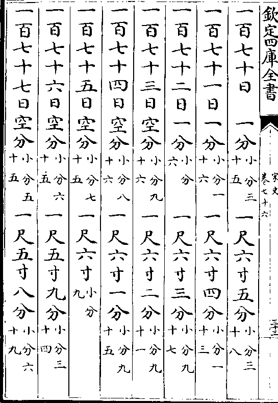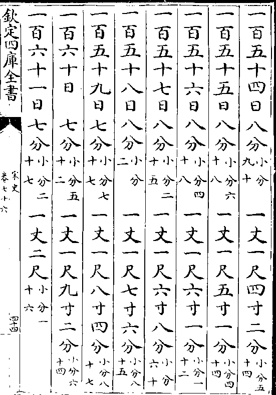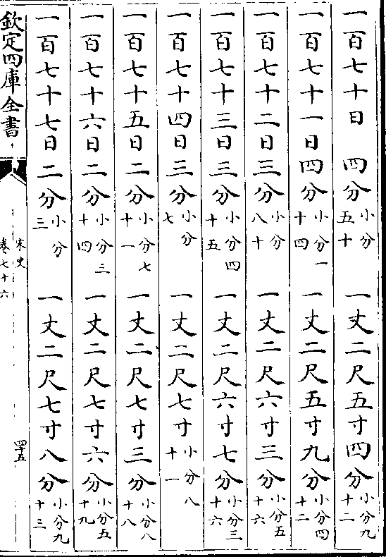 一百七十日 四分(小分五十) 一丈二尺五寸四分(小分九十二)一百七十一日四分(小分一十四) 一丈二尺五寸九分(小分四十二)