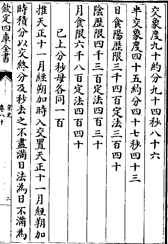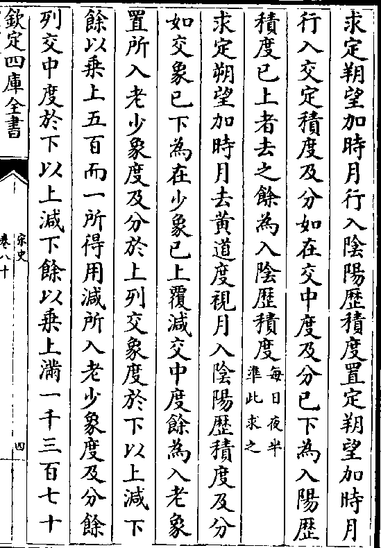 求定朔望加时月行入阴阳历积度置定朔望加时月行入交定积度及分如在交中度及分已下为入阳历
