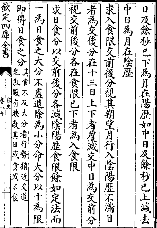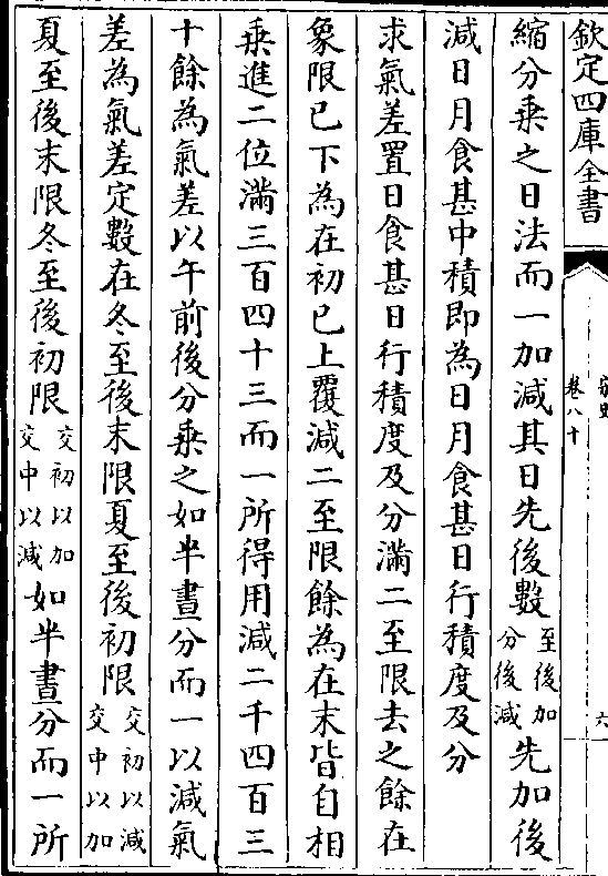 减日月食甚中积即为日月食甚日行积度及分求气差置日食甚日行积度及分满二至限去之馀在