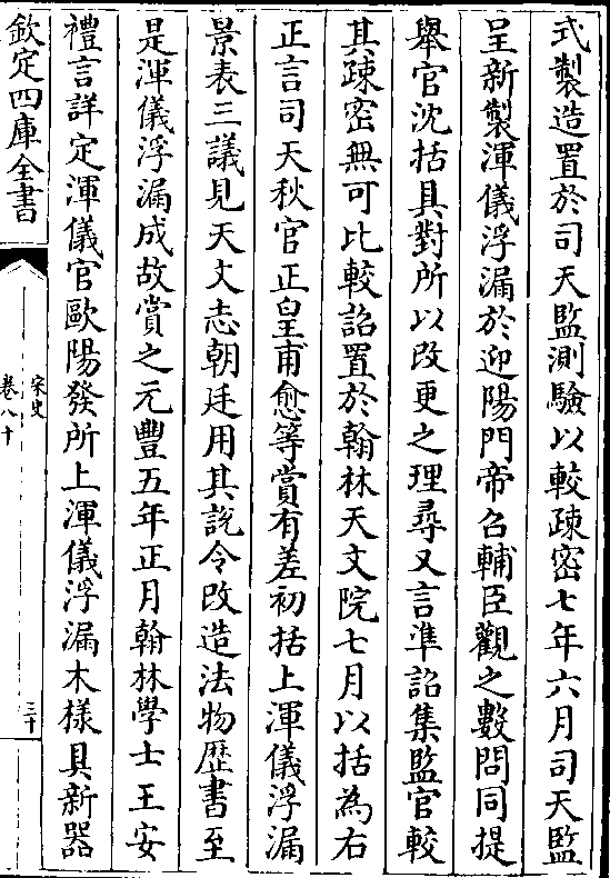 式制造置于司天监测验以较疏密七年六月司天监呈新制浑仪浮漏于迎阳门帝召辅臣观之数问同提