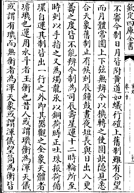 而月体常圆上下弦无辨今以机转之使圆缺隐见悉合天象旧制止有候刻辰钟鼓昼夜短长与日出入更