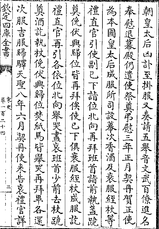 朝皇太后凶讣至挂服又奏请五举音文武百僚进名奉慰退幕殿仍遣使祭奠吊慰三年正月契丹贺正使