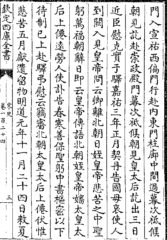 门入宣祐西偏门行赴内东门柱廊中间过幕次祗候朝见讫赴崇政殿门幕次祗候朝见皇太后讫出三日