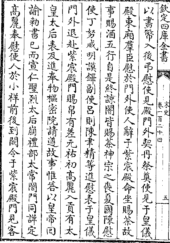 殿东厢群臣慰于门外使人辞于紫宸殿命坐赐茶故事赐酒五行自是终谅闇皆赐茶神宗之丧夏国陈慰