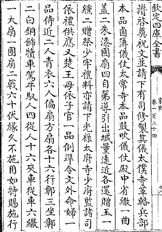 本品卤簿仪仗太常寺本品鼓吹仪仗殿中省伞一曲盖二朱漆团扇四自第导引出城量远近各还赠玉一