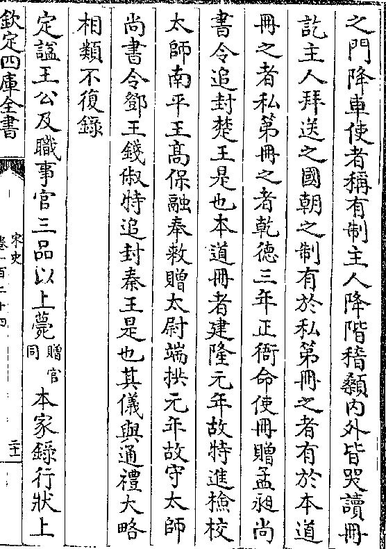 之门降车使者称有制主人降阶稽颡内外皆哭读册讫主人拜送之国朝之制有于私第册之者有于本道