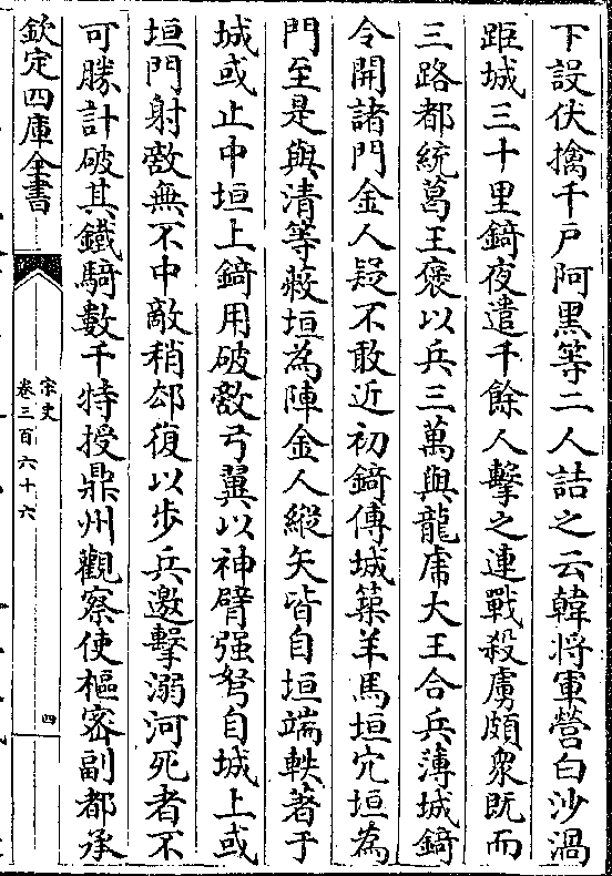 下设伏擒千户阿黑等二人诘之云韩将军营白沙涡距城三十里锜夜遣千馀人击之连战杀虏颇众既而