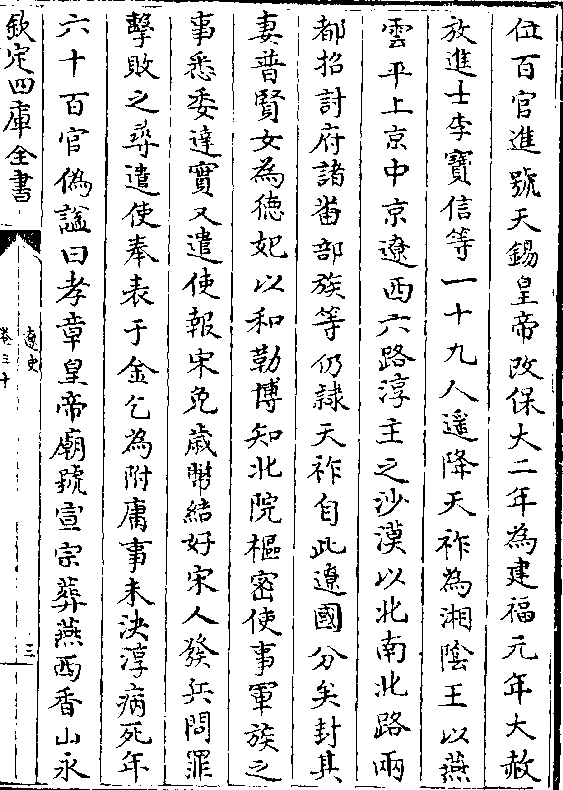 位百官进号天锡皇帝改保大二年为建福元年大赦放进士李宝信等一十九人遥降天祚为湘阴王以燕