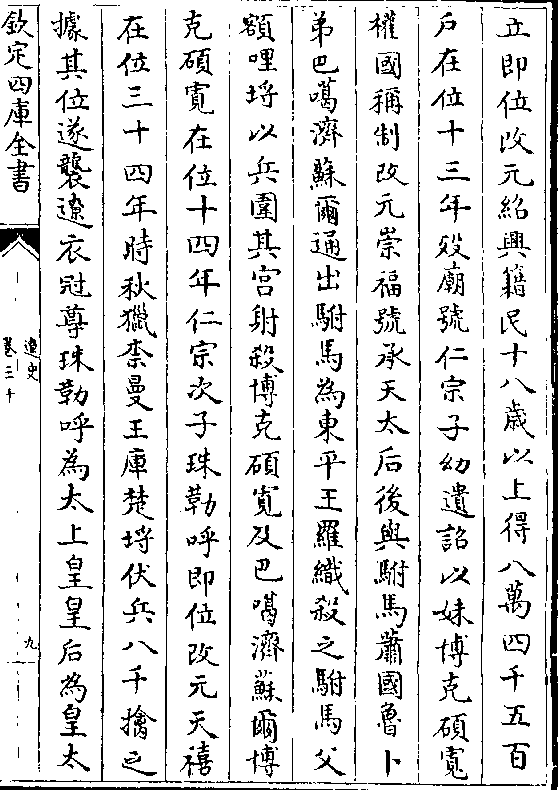 立即位改元绍兴籍民十八岁以上得八万四千五百户在位十三年殁庙号仁宗子幼遗诏以妹博克硕宽