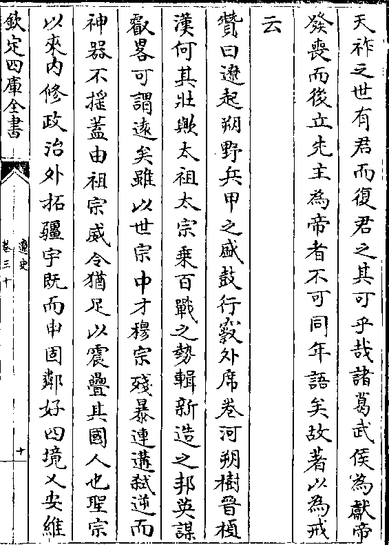 持二百馀年之基有自来矣降臻天祚既丁未运又觖人望崇信奸回自㭬国本群下离心金兵一集内难先