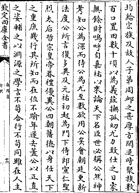 均给宗族及故人子弟周恤之甚厚方闲退时聚族数百口置田数十顷以为义庄抚孤幼尤力致仕之日家