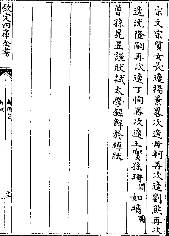 宗文宗质女长适杨景略次适母轲再次适刘熊再次适沈隆嗣再次适丁恂再次适王实孙瑨(阙)如璃(阙)