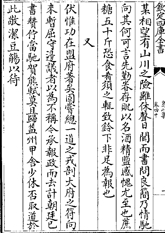 某相望有山川之险虽休声日闻而书问良简乃情驰向其何可言先勤眷存贶以名酒精盐感愧尤至也蔗