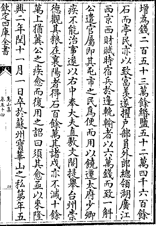 增为钱二百五十三万馀缗盐五十二万四千六百馀石而亭民亦以致富羡遂擢户部员外郎总领湖广江