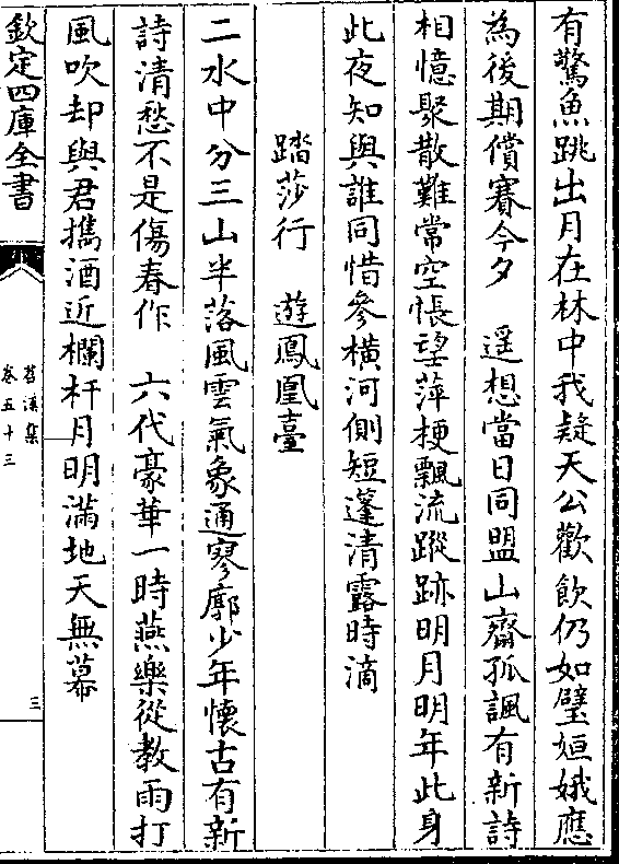 有惊鱼跳出月在林中我疑天公欢饮仍如璧姮娥应为后期偿赛今夕 遥想当日同盟山斋孤讽有新诗