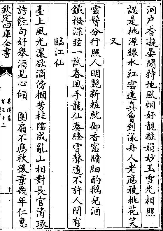 洞户香凝晏间特地风烟好靓妆娟妙玉雪光相照认是桃源绿水红云绕真曾到漾舟人老应被桃花笑