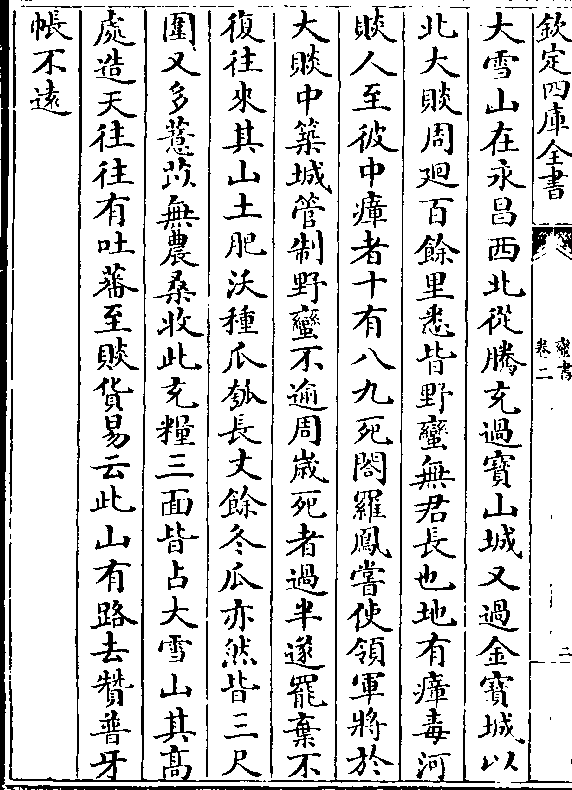 大雪山在永昌西北从腾充过宝山城又过金宝城以北大赕周迥回百馀里悉皆野蛮无君长也地有瘴毒河