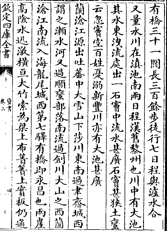 有桥三十一阔长三百馀步徒行七日程与泸水合又量水川在滇池南两日程汉旧黎州也川中有大池