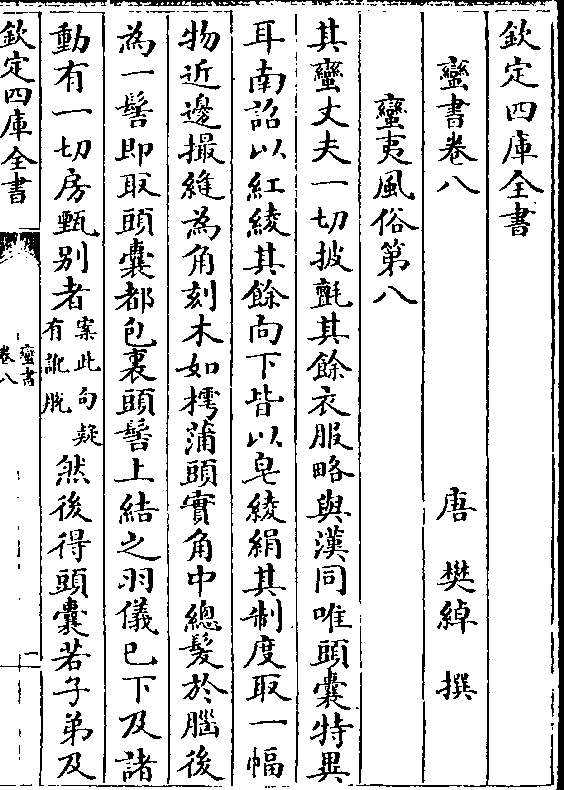 其蛮丈夫一切披毡其馀衣服略与汉同唯头囊特异