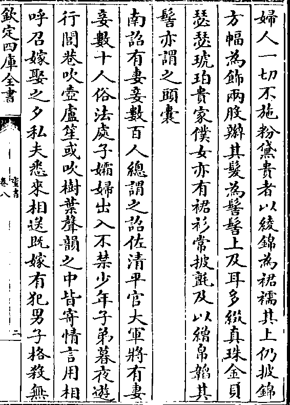 妇人一切不施粉黛贵者以绫锦为裙襦其上仍披锦方幅为饰两股辫其发为髻髻上及耳多缀真珠金贝