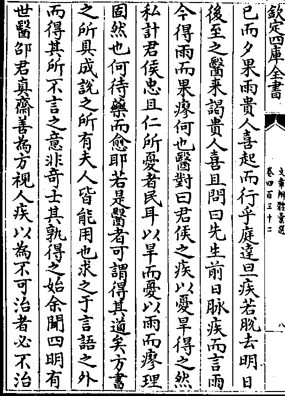 已而夕果雨贵人喜起而行乎庭达旦疾若脱去明日后至之医来谒贵人喜且问曰先生前日脉疾而言雨