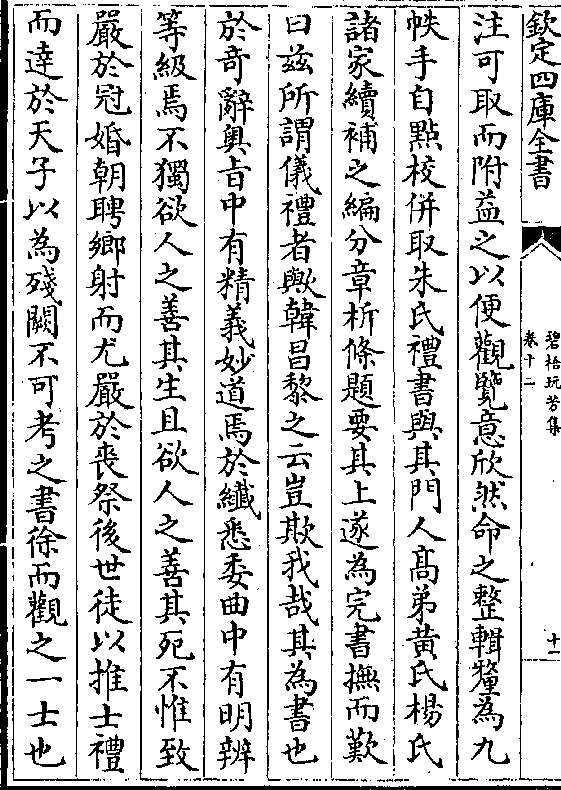 注可取而附益之以便观览意欣然命之整辑釐为九帙手自点校并取朱氏礼书与其门人高弟黄氏杨氏