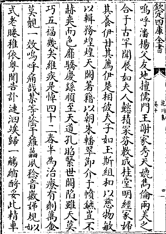 呜呼潘杨父友地擅儒门王谢家秀天媲隽伦两美之合于古罕闻展如夫人懿积罙芬教成桂堂明经冢妇