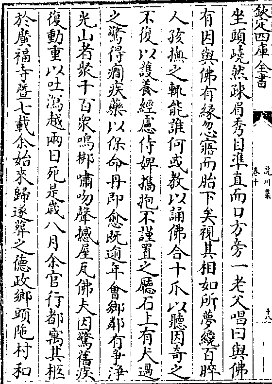 坐头峣然疏眉秀目准直而口方旁一老父唱曰与佛有因与佛有缘忽寤而胎下矣视其相如所梦才百晬