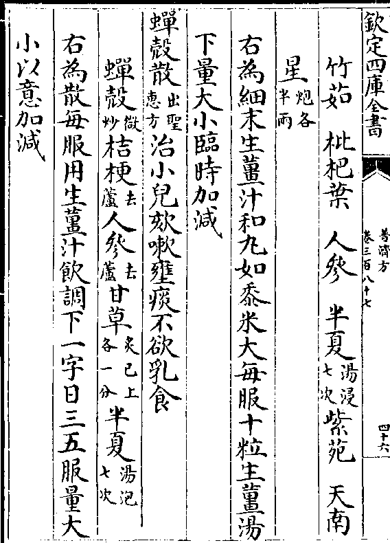 冲于心肺结积于胃脘即嗽是名胃嗽以珍珠丸下之后服治嗽药(王芮知县绍兴庚戌九月孙男新生五十/馀日病嗽召医皆言医书称百日内而嗽)