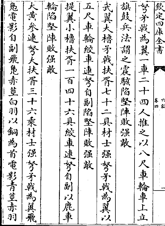 弩矛戟为翼一车二十四人推之以八尺车轮车上立旗鼓兵法谓之震骇陷坚阵败强敌