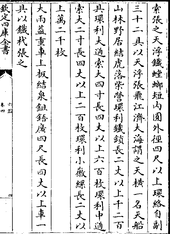 索张之天浮铁螳螂短内圆外径四尺以上环络自副三十二具以天浮张飞江济大海谓之天横一名天船