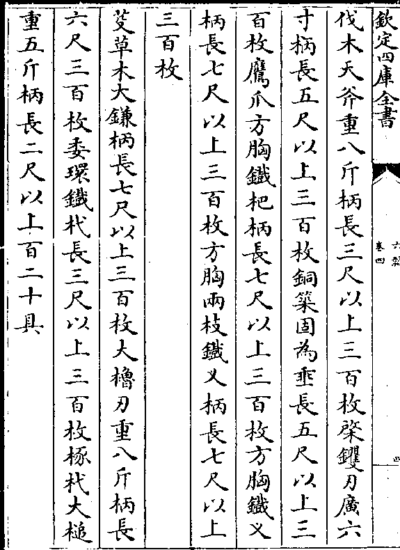 伐木天斧重八斤柄长三尺以上三百枚棨钁刃广六寸柄长五尺以上三百枚铜筑固为
