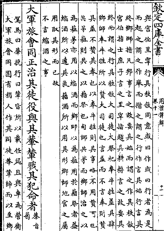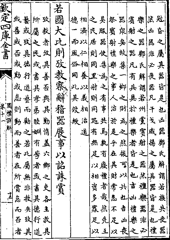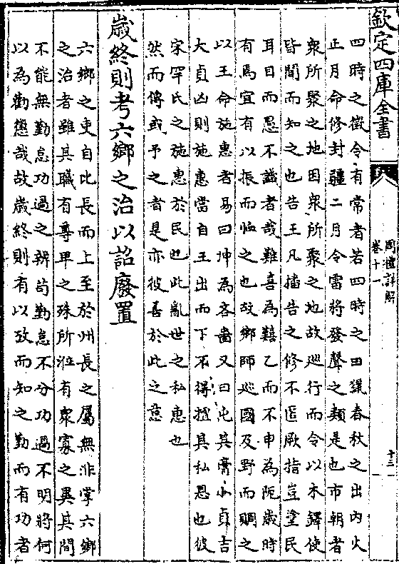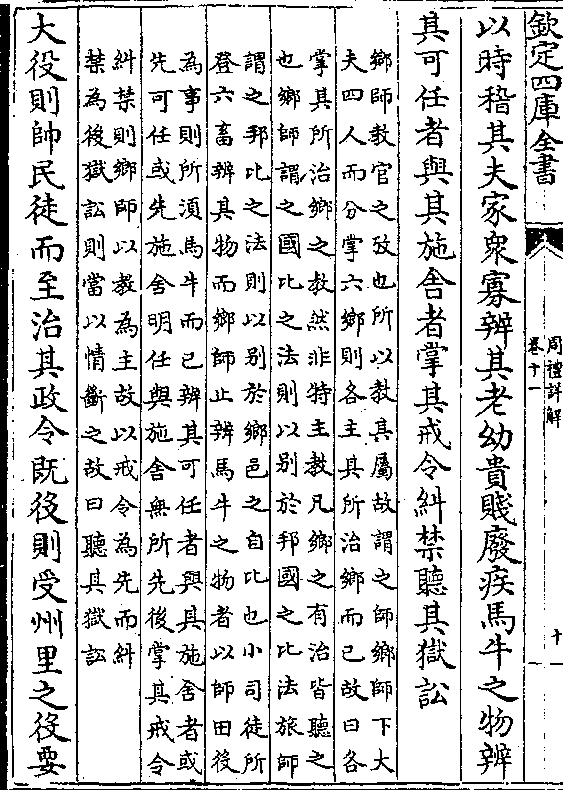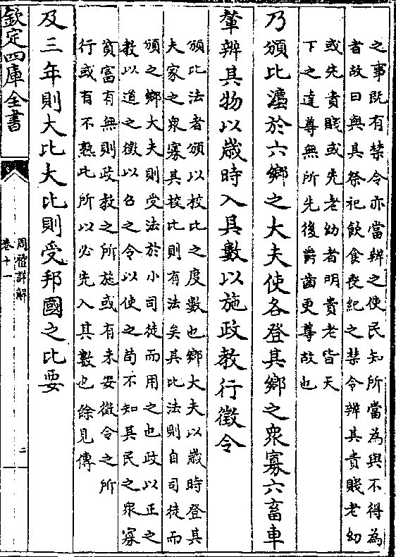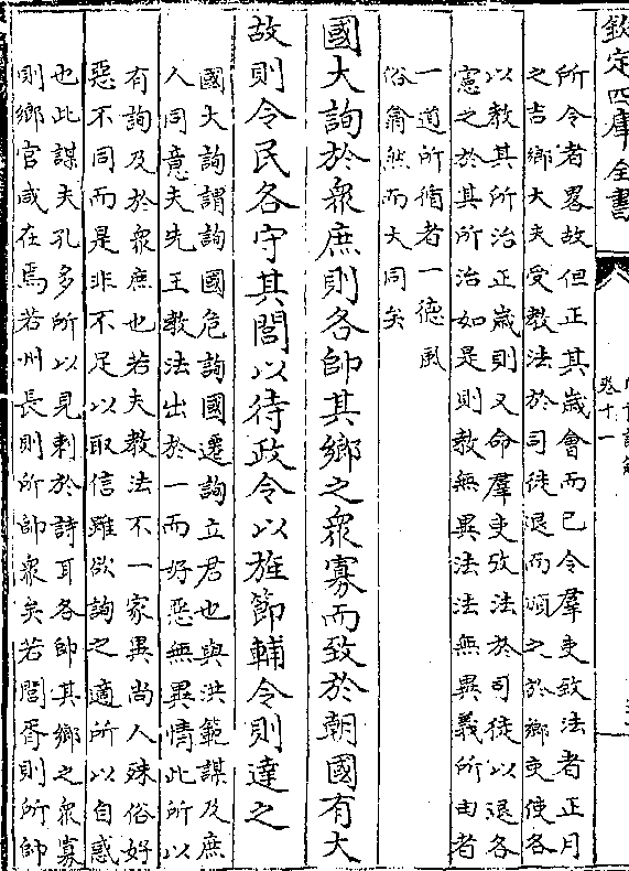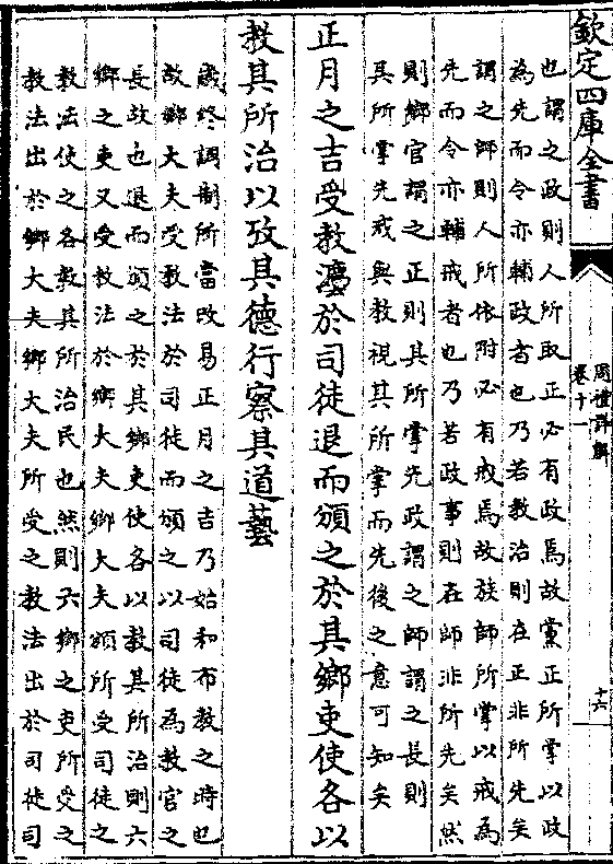 (所令者略故但正其岁会而已令群吏致法者正月/之吉乡大夫受教法于司徒退而颁之于乡吏使各)(以教其所治正岁则又命群吏考法于司徒以退各/宪之于其所治如是则教无异法法无异义所由者)