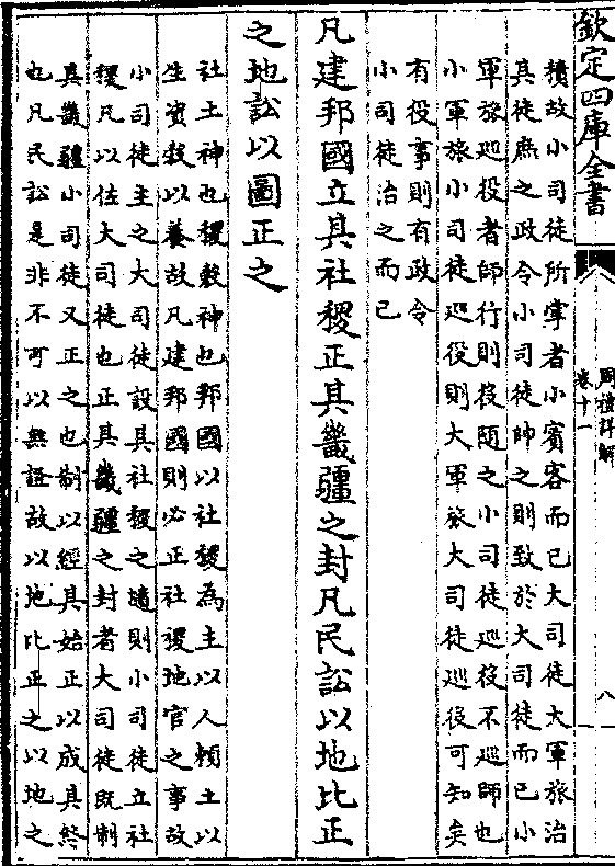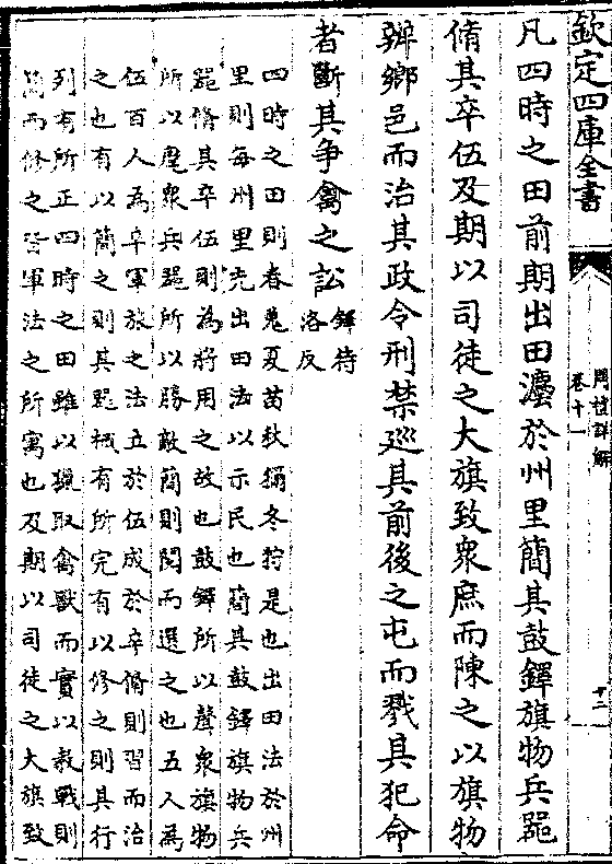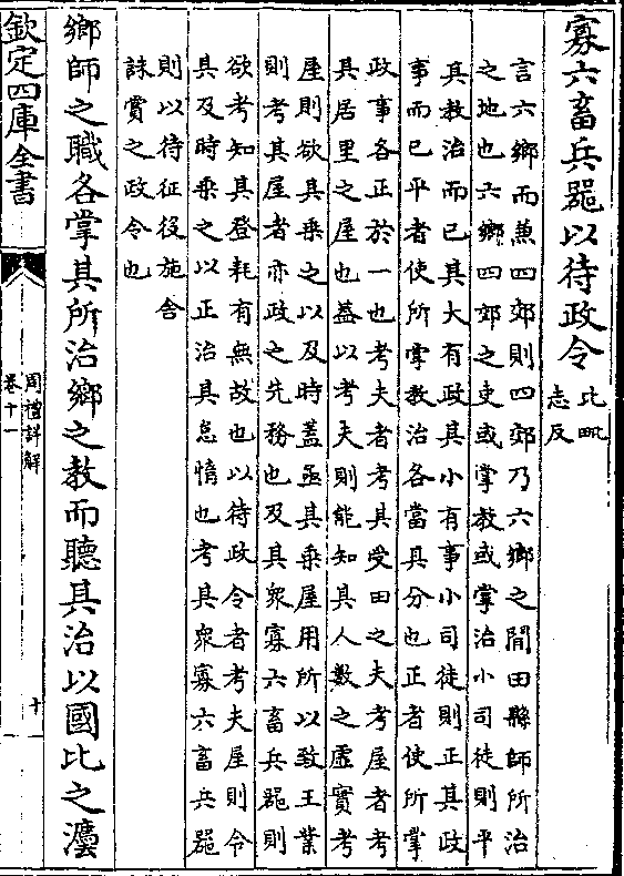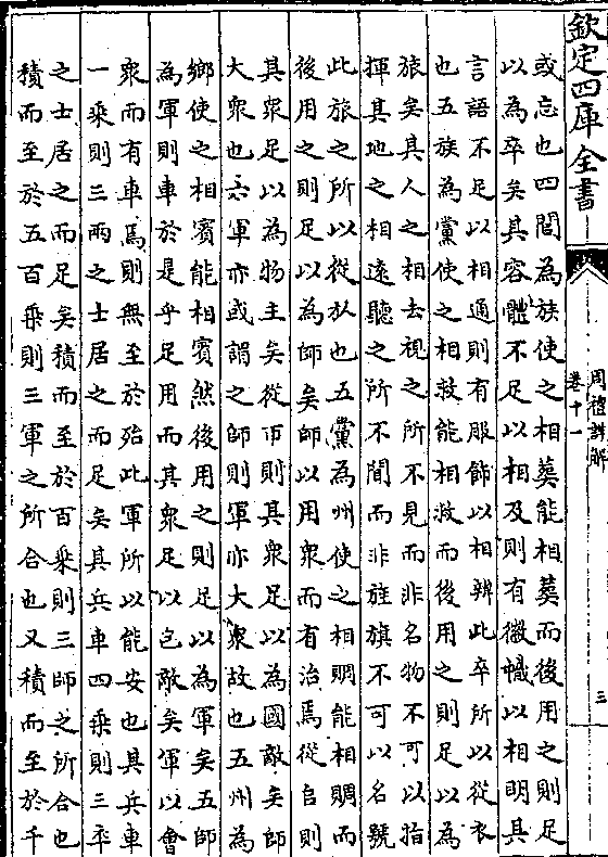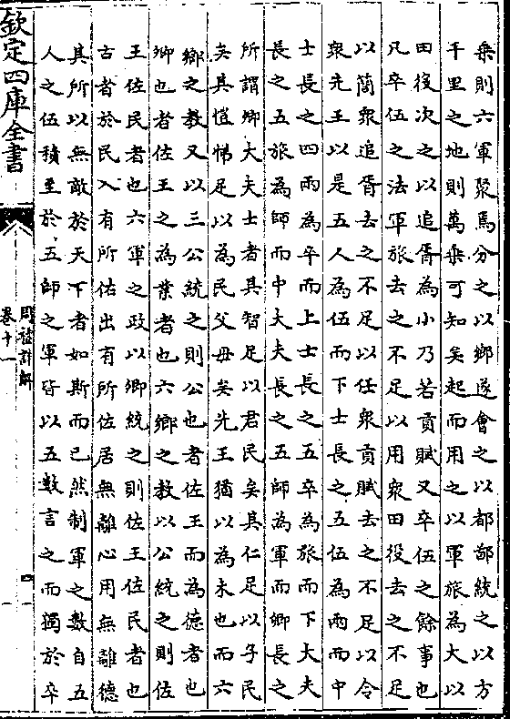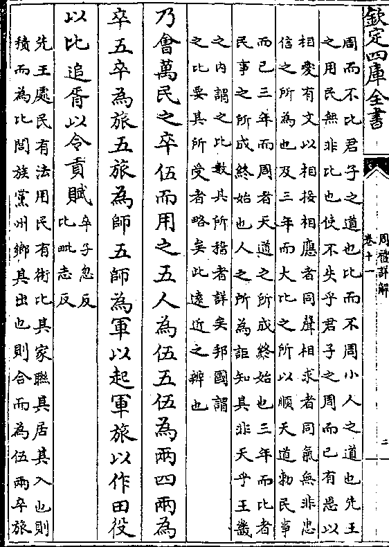 (师军所以因内政而寄军令也方其平居无事之时/则有教养之素而恩义足以相结及其仓卒有事之)(际则有法令之习而死生足以相托此小司徒所以/会万民之卒伍而用之也五家为比使之相保能相)