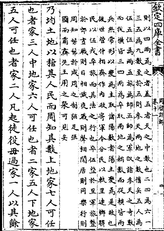 (则以四两为之者盖五者天之中数也二四为六一/三五为九数至于五则参天两地之数备矣五人为)(伍五伍为两五旅为师五师为军取诸参天之奇数/而从横皆三四两为卒取两地之耦数而从横皆两)
