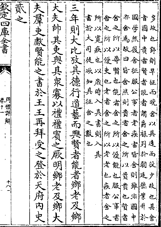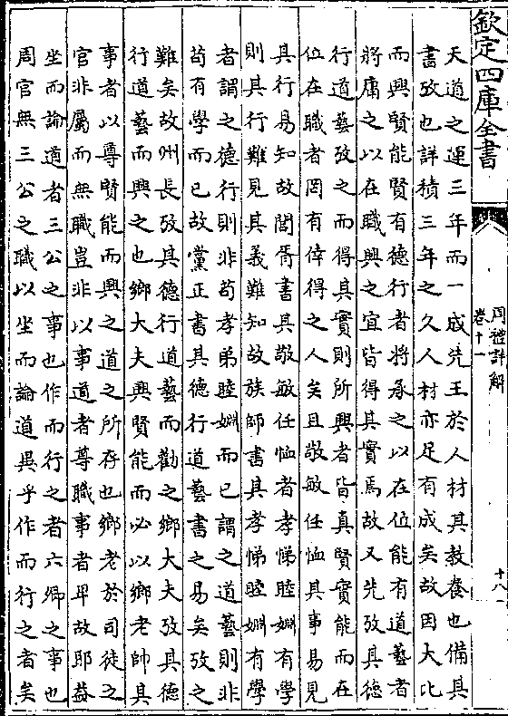 (天道之运三年而一成先王于人材其教养也备其/书考也详积三年之久人材亦足有成矣故因大比)(而兴贤能贤有德行者将承之以在位能有道艺者/将庸之以在职兴之宜皆得其实焉故又先考其德)
