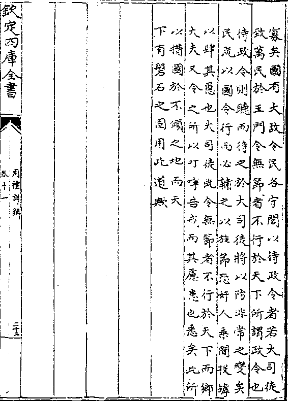 (寡矣国有大故令民各守闾以待政令者若大司徒/致万民于王门令无节者不行于天下所谓政令也)(待政令则听而待之于大司徒将以防非常之变矣/民既以国令行而必辅之以旌节恐奸人乘间投罅)